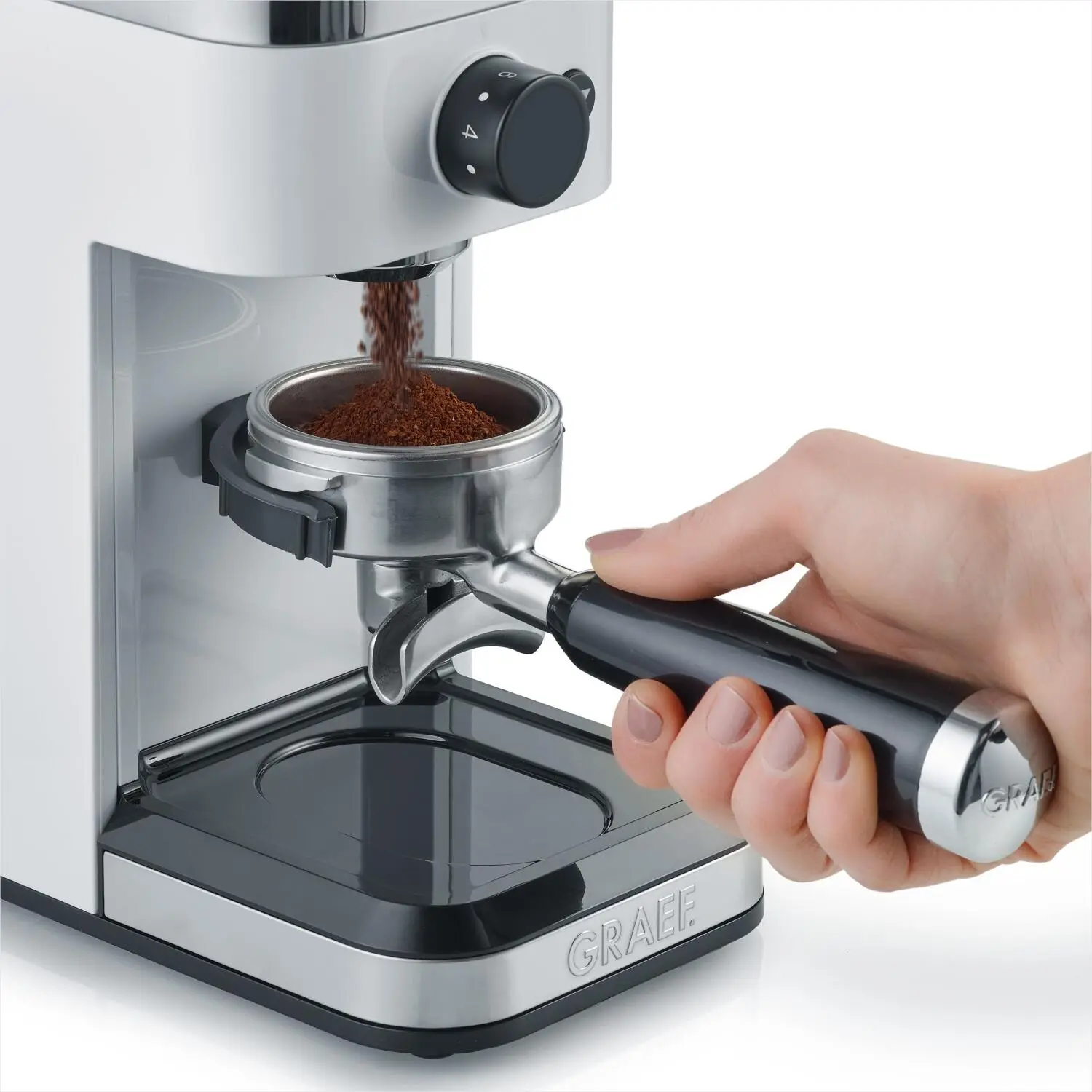 Die Kaffeemühle CM 501 von GRAEF besitzt ein Edelstahl-Kegelmahlwerk. Das Kegelmahlwerk hat den Vorteil, durch geringe Drehzahlen keine oder wenig Hitze zu erzeugen, dadurch ist das Mahlen aromaschonender. Der auf 140 Stufen einstellbare Mahlgrad bildet die Grundlage für den individuellen Kaffeegenuss. Es kann direkt in den Siebträger, den Kaffeefilter oder den Kaffeemehlbehälter gemahlen werden. Dank der ’Grind on Demand’-Funktion, also die automatischen Mahlfunktion für Siebträger, stimmen Sie die Kaffeemehlmenge ganz individuell auf Ihre Bedürfnisse ab. Sie halten den Siebträger einfach so lange an den Kontaktschalter bis er voll ist. Es gibt nichts über frisch gemahlene Kaffeebohnen mit vollstem Aroma.