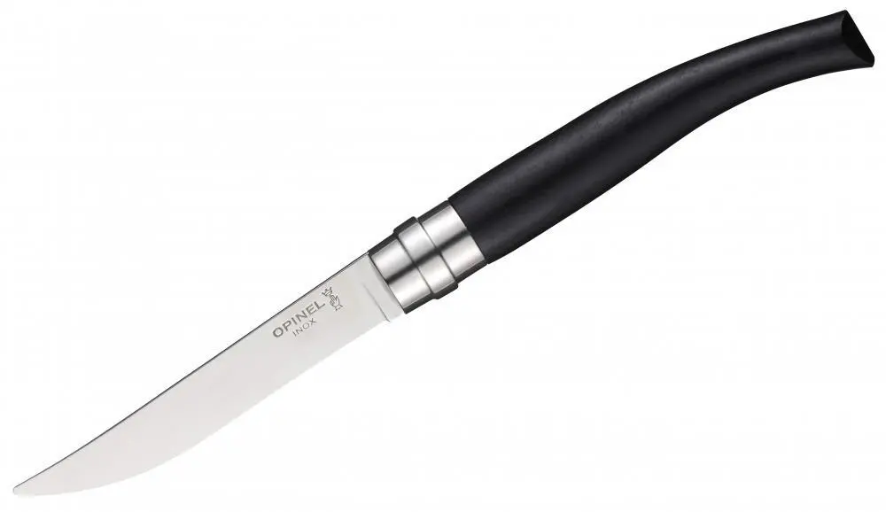 Opinel hat bereits mit einigen Taschenmesser-Modellen bewiesen, dass Ebenholz kombiniert mit einer hochglanzpolierten Klinge aus rostfreiem Stahl für ein dekoratives und edles Erscheinungsbild sorgt. In diesem Fall – bei dem Steakmesserset – wurden die Materialien für einen Satz Steakmesser aus der Serie Table Chic genutzt, der wiederum optisch an den Slim-Line-Modellen orientiert ist. Allerdings verfügen diese Steakmesser über eine festere Klinge. Darüber hinaus ist die Metallzwinge, die Klinge und Griff miteinander verbindet, wie bei allen Modellen dieser Serie, an einer Seite abgeflacht und verhindert so, dass das Messer ungewollt beim Ablegen auf dem Tisch wegrollt. So sorgen die eleganten Messer sowohl für einen Augenschmaus als auch für einen geschmacklichen Genuss.