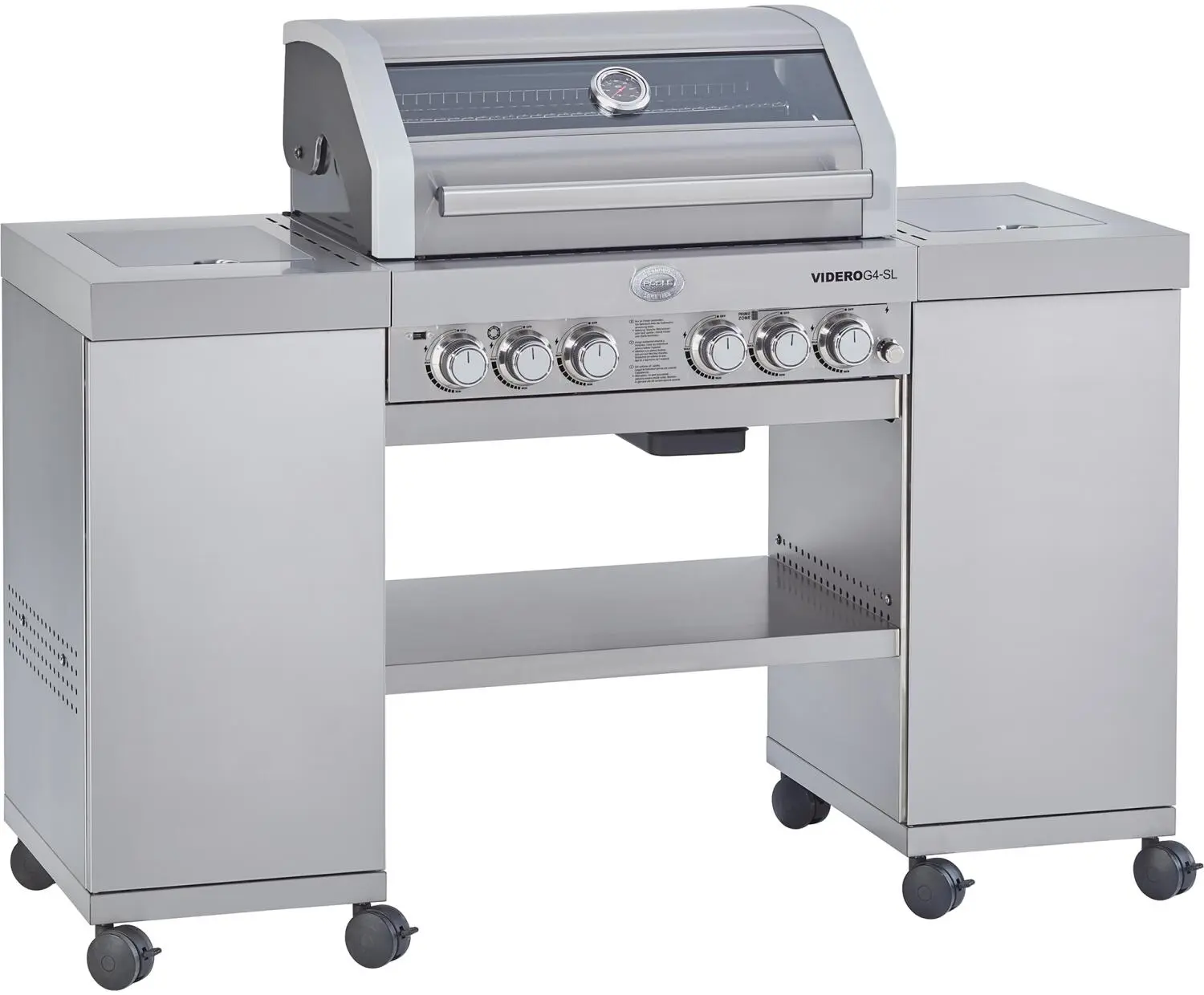 Rösle BBQ-Island VIDERO G4-SL Vario+ aus Edelstahl. Gasbetriebener VIDERO G4-SL Vario+ BBQ-Grill ab dem Modelljahr 2021 mit 4 Hauptbrennern aus Edelstahl, komfortabler Haupt-Grillfläche, Warmhalterost, Seitenbrenner, Primezone im Seitentisch, beleuchteten Drehknöpfen, Deckelthermometer u.v.m.