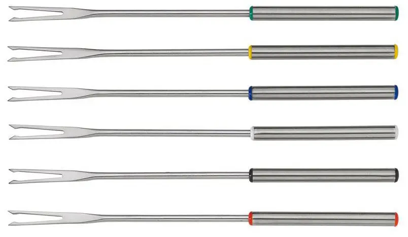Die Fleisch-Fondue-Gabel liegt gut in der Hand und ist lang genug, um den Sicherheitsabstand zum heißen Fett oder der Brühe zu wahren. Dank der farblichen Kennzeichnung sind Verwechslungen ausgeschlossen, doch natürlich kann jeder am Tisch freiwillig ein Stück saftiges Rind gegen einen zarten Happen Pute tauschen. Auf den spitzen Gabeln spießen Sie das Fleisch leicht auf und es geht nicht in den Tiefen des Topfes verloren.