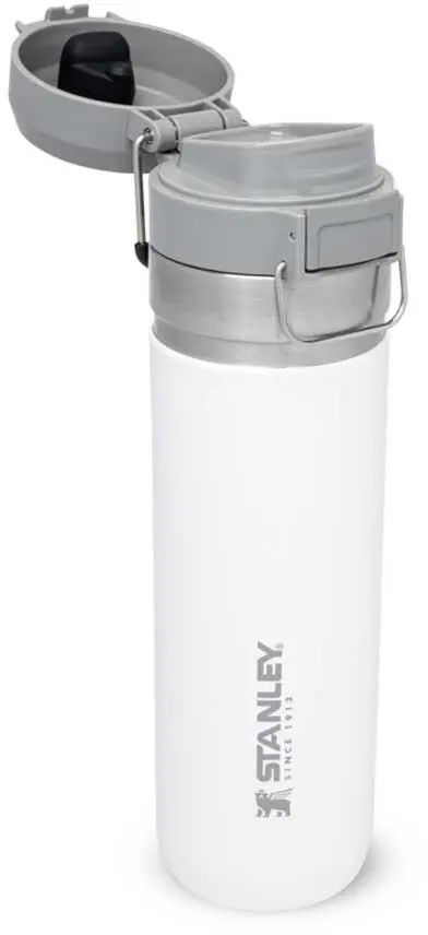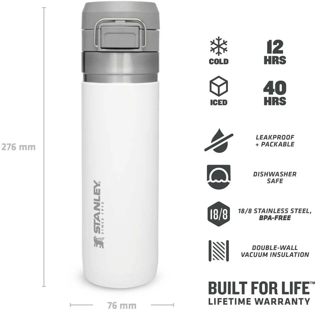 Ob für die Outdoor-Tour, den Sport oder einfach On The Road, die Stanley QUICK-FLIP WATER BOTTLE ist der ideale Begleiter gegen den Durst. Die auslaufsichere Flasche ist mit einem innovativen, zweistufigen Sicherheitsverschluss ausgestattet. Beim Transport wird der Verschluss gegen unbeabsichtigtes Öffnen von einem Edelstahlbügel fixiert. Wird dieser gelöst und der Push-Button Knopf gedrückt, flippt der Deckel federunterstützt auf. Die Trinkflasche aus rostfreiem 18/8-Edelstahl mit Vakuumisolierung besitzt ein Fassungsvermögen von 709 ml und hält Getränke bis zu 8 Stunden heiß oder 12 Stunden gekühlt. Die Flasche passt in gängige PKW-Getränkehalter und ist mit einem beweglichen Bügel zum Anhängen an den Rucksack oder Tragegriff ausgestattet. Alle Teile können in der Spülmaschine gereinigt werden. BPA-frei.