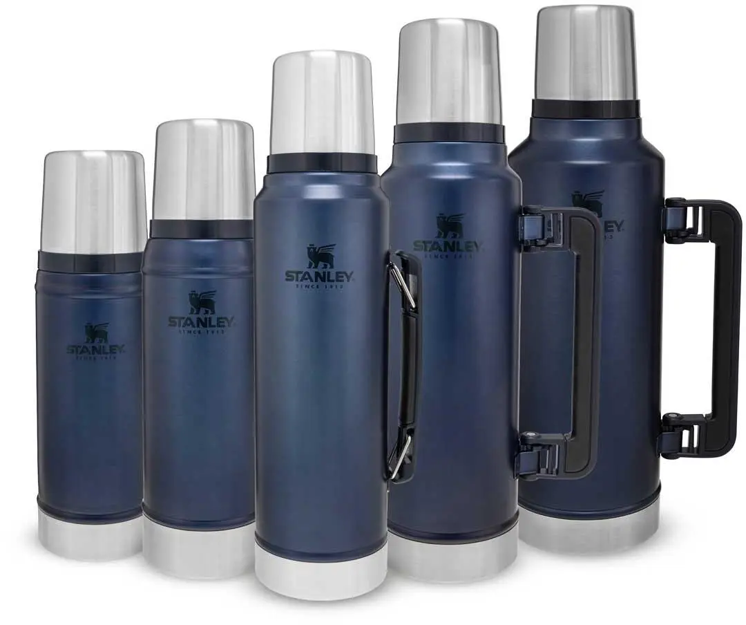 Ideal für das Picknick. In der Stanley Classic Vakuum-Flasche aus rostfreiem Edelstahl kann man sowohl warme als auch kalte Getränke mitnehmen. Eine Doppelwand gewährleistet eine gute Isolation und hält die Flüssigkeit bis zu 15 Stunden kalt oder 15 Stunden heiß. Die Flasche weist eine 5 cm weite Öffnung auf und lässt sich so leicht reinigen. Praktisch ist der isolierte Deckel mit Gefäßfunktion. Das Gehäuse ist mit einer robusten Lackierung in Nightfall blau versehen. Fassungsvermögen 0,47 Liter.