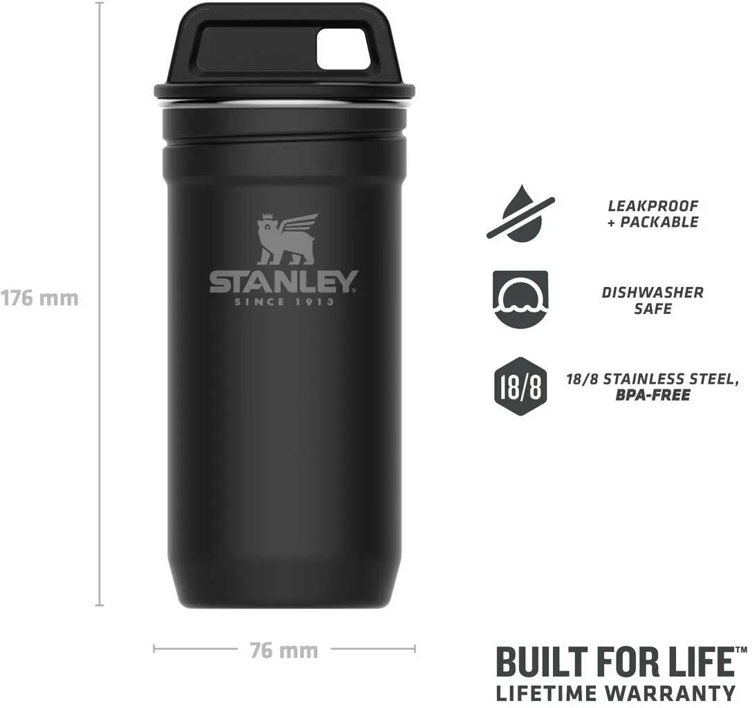 Das Stanley ADVENTURE SHOT GLASS SET besteht aus 4 Edelstahl-Bechern (shot glasses) mit einem Fassungsvermögen von je 59 ml aus rostfreiem 18/8 Edelstahl, die in einem formschönen Edelstahlbehälter in Mattschwarz mit Schraubverschluss verpackt sind. Das Set kann dank Aufhängeöse flexibel am Gepäck angebracht werden, und alle Teile sind spülmaschinenfest.