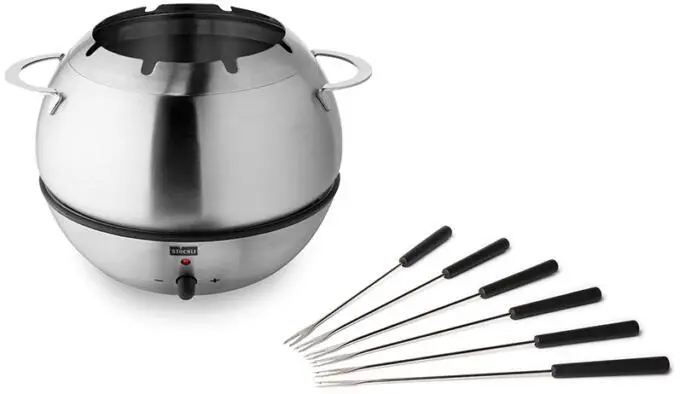 Stöckli Fonduegarnitur Hot Bowl. Die elektrische Fonduegarnitur bietet Fonduespaß für bis zu 6 Personen. Der Fonduetopf inklusive Spritzschutz besteht aus hochwertigem Edelstahl und ist besonders pflegefreundlich.