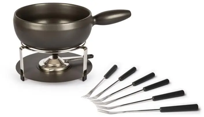 Stöckli Käsefonduegarnitur Atlantis, anthrazit. Fonduespaß für bis zu 6 Personen. Induktionsfähiger Caquelon aus Keramik, Rechaud mit Pasten-Sicherheitsbrenner sowie 6 Fonduegabeln sind bei dem Fondue-Komplettpaket enthalten.