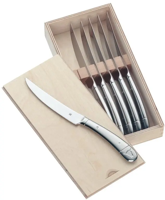 WMF Steakmesser Set 6 Stück Geschenkidee. Besonders lecker schmeckt Gegrilltes außen knusprig und innen saftig zart. Das Steakbesteck-Messer hat eine besonders scharfe Klinge aus Spezialklingenstahl und ist mit Wellenschliff versehen. Der Griff des Messers liegt gut in der Hand.